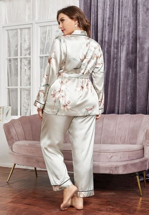 This elegant pajama set features a soft, silky top with a charming floral print and matching pants. The wrap-around design of the top includes a tie belt for a personalized fit, ensuring both comfort and style. Perfect for relaxing evenings or adding a touch of elegance to your loungewear collection.