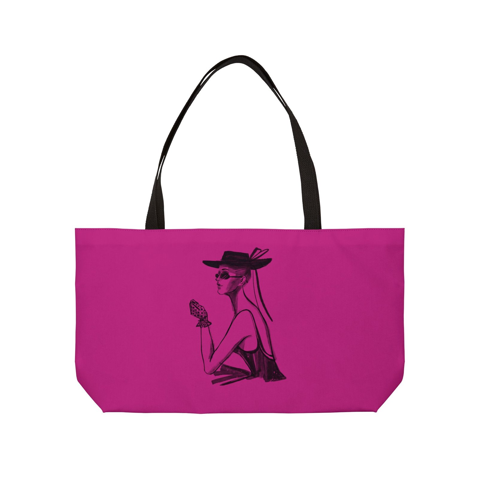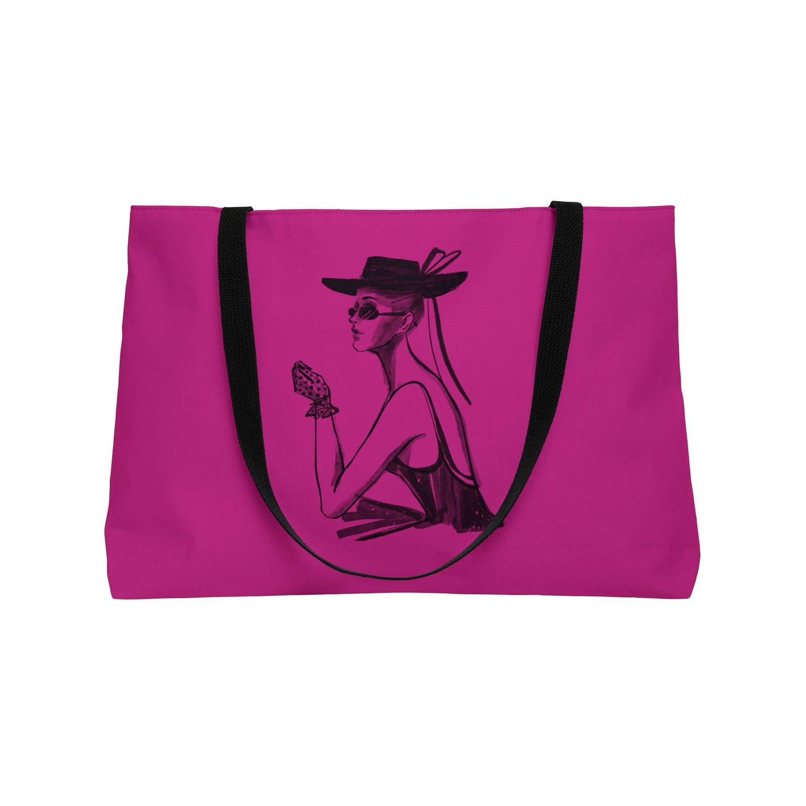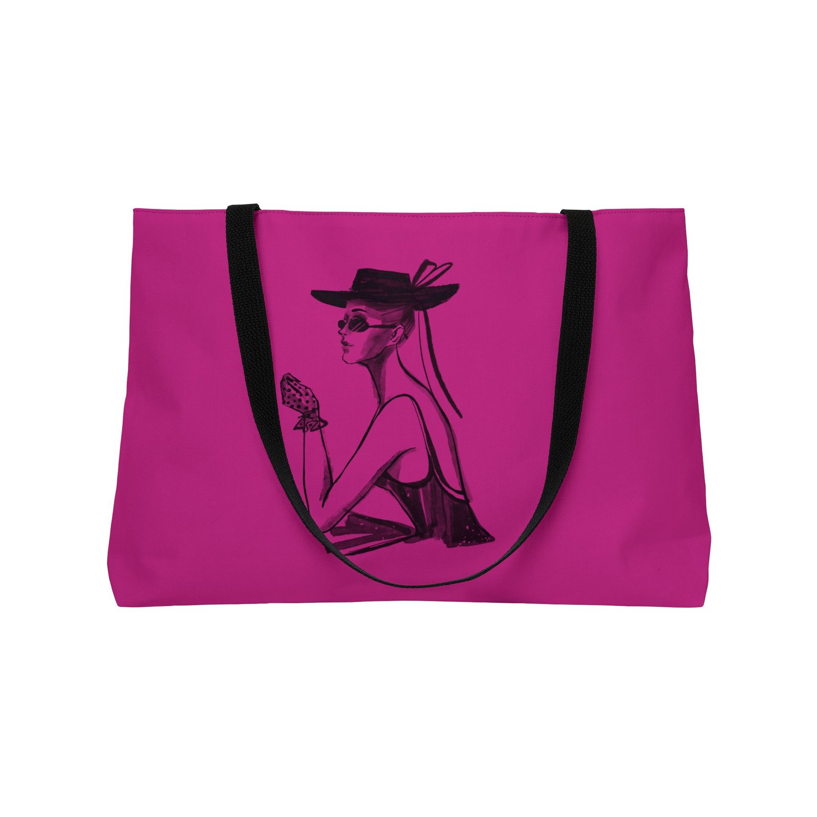 Bright, roomy weekender tote that carries a bold, fashion-forward attitude. The vibrant all-over print pops on a smooth spun polyester exterior while the black woven handles and lining add contrast and structure. T-bottom construction gives extra capacity and shape, so it holds everything from a weekend wardrobe to market finds. Lightweight and durable, it travels easily and keeps its crisp look without ironing. Hand-drawn illustration on the front adds a chic, vintage-inspired flair—think sunhat afternoons, city strolls, and confident departures.