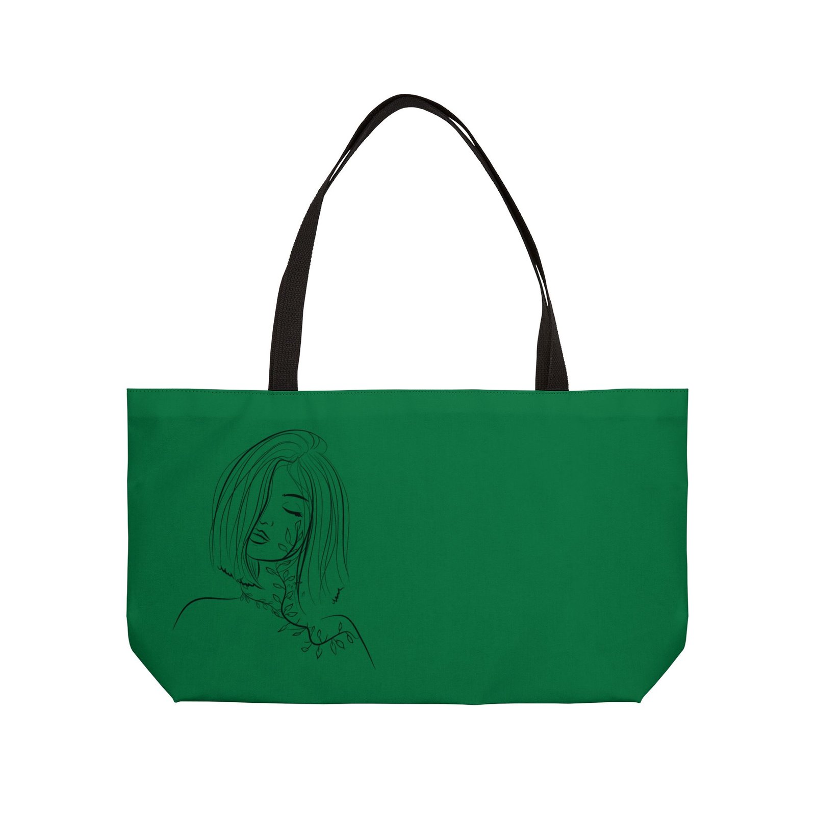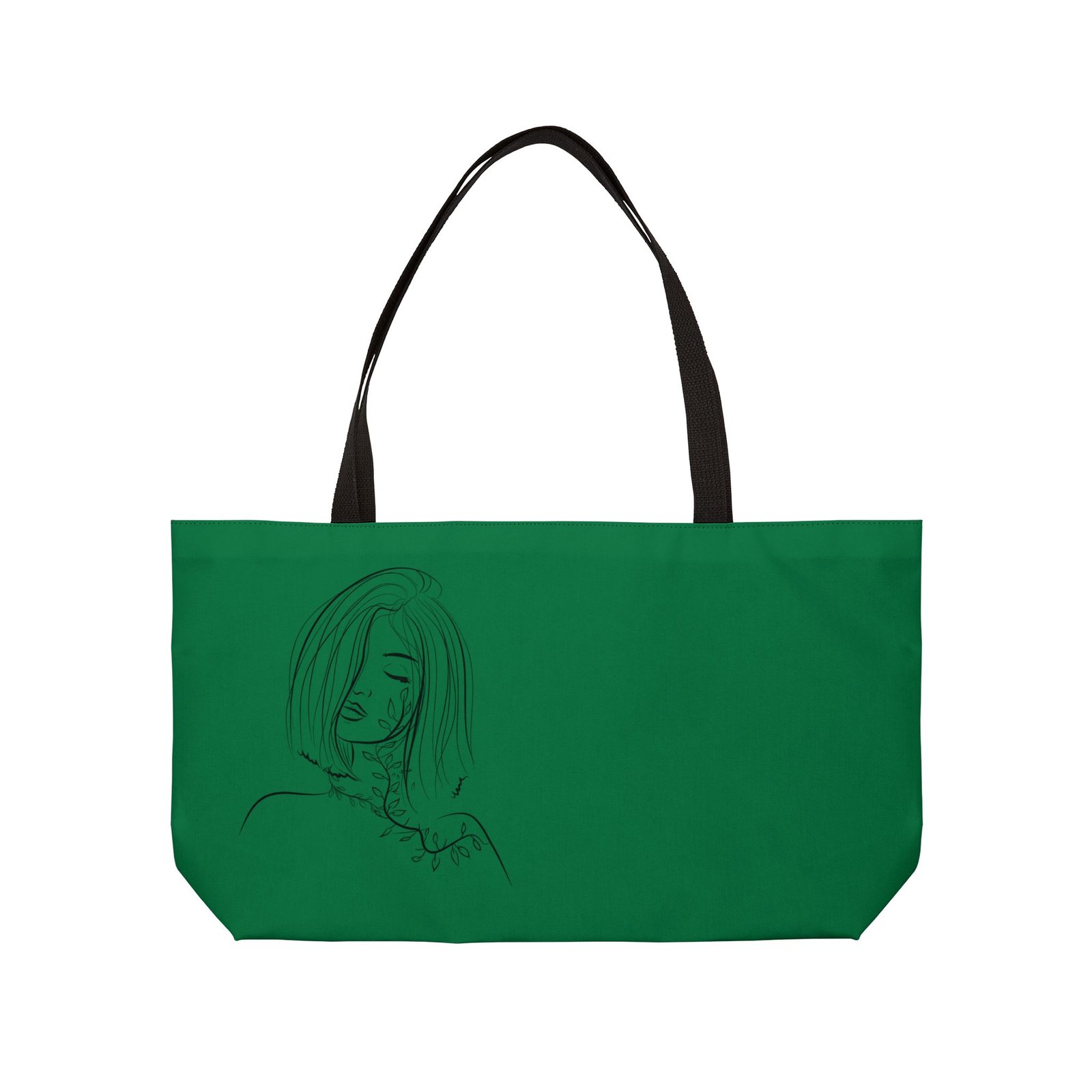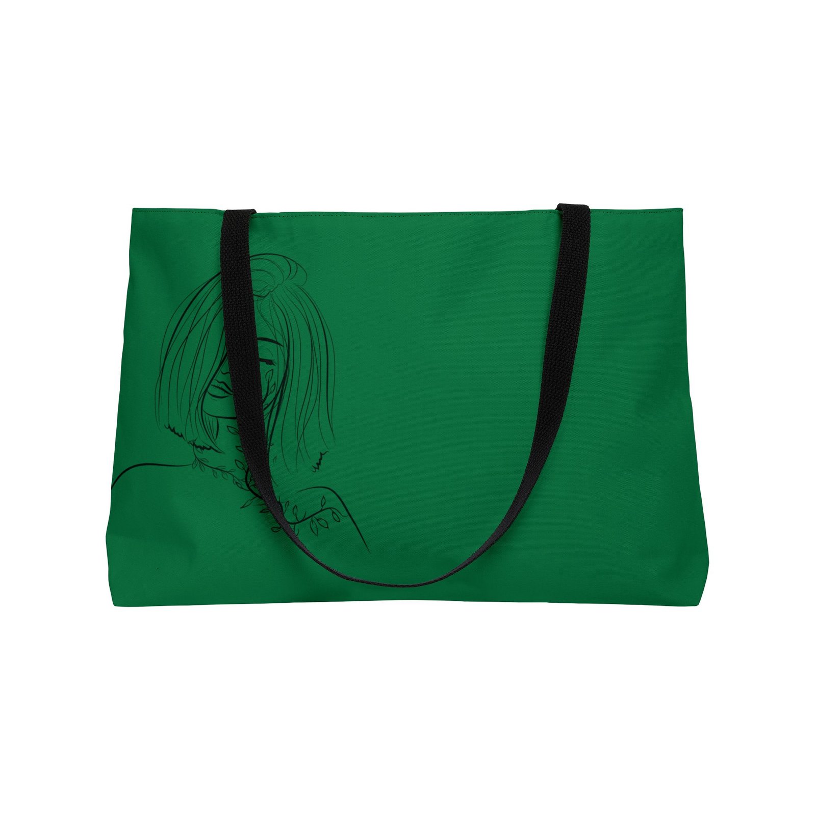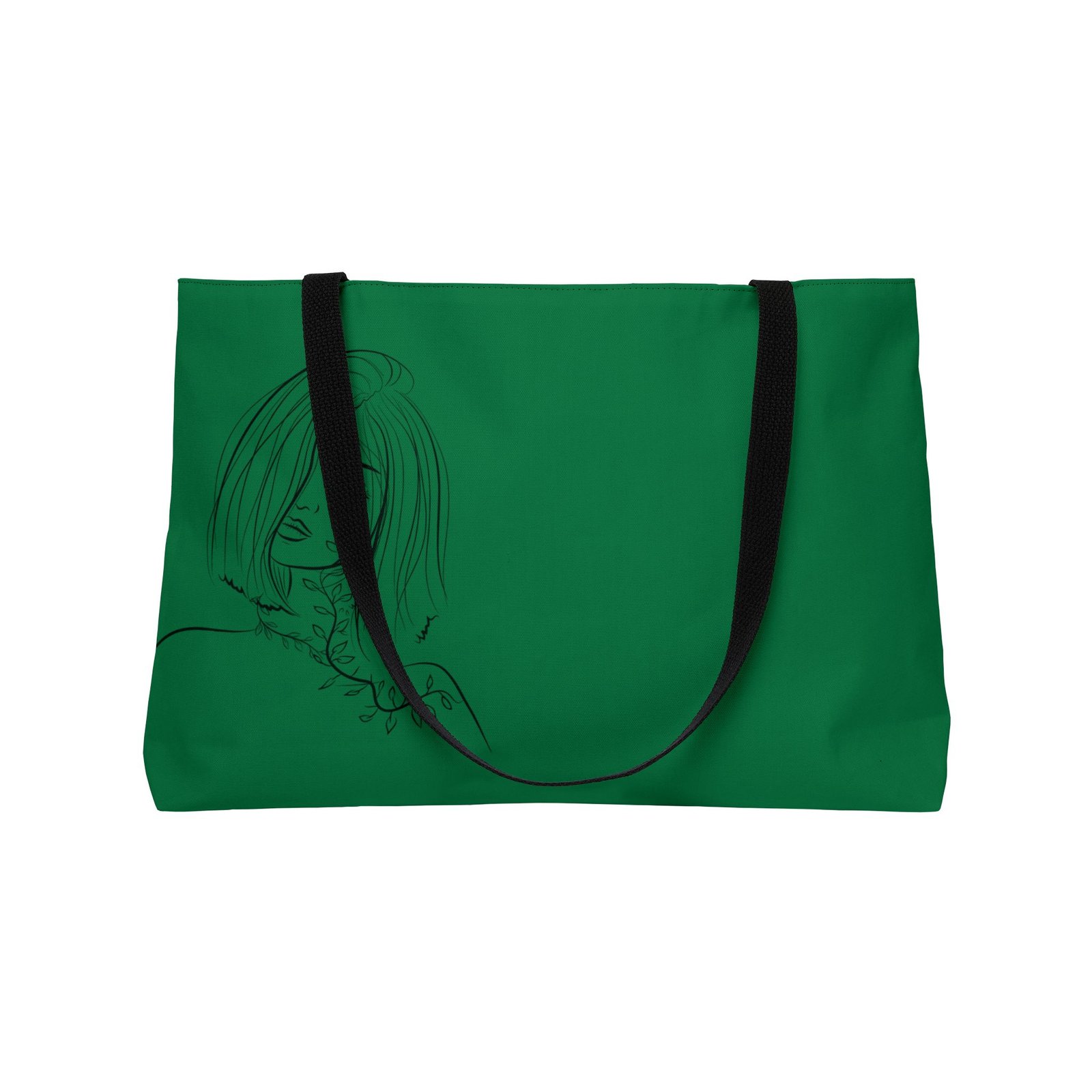 This roomy Weekender Tote blends effortless style with everyday practicality. The deep green canvas showcases a subtle, hand-drawn portrait that feels quiet and introspective — like a little moment of calm you can carry. Soft black handles and a black-lined interior keep the look streamlined, while the T-bottom shape gives the bag structure for groceries, art supplies, or an overnight change of clothes. It’s lightweight, colorfast, and made to move with you — from slow mornings at a café to spontaneous weekend getaways.