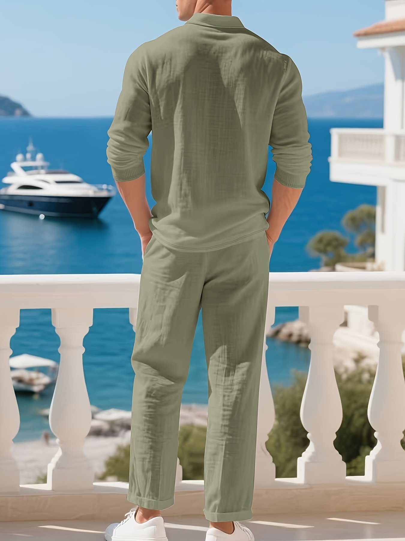 Step into timeless sophistication with the Men’s Casual Linen Set—perfect for embracing those mild spring and autumn days. Designed with practicality and elegance, this set comprises a loose, breezy linen Henley shirt paired with relaxed-fit wide-leg pants. Whether you’re strolling along a sunlit beach or enjoying a laid-back weekend, this ensemble is an ideal companion for your moments of leisure and style.