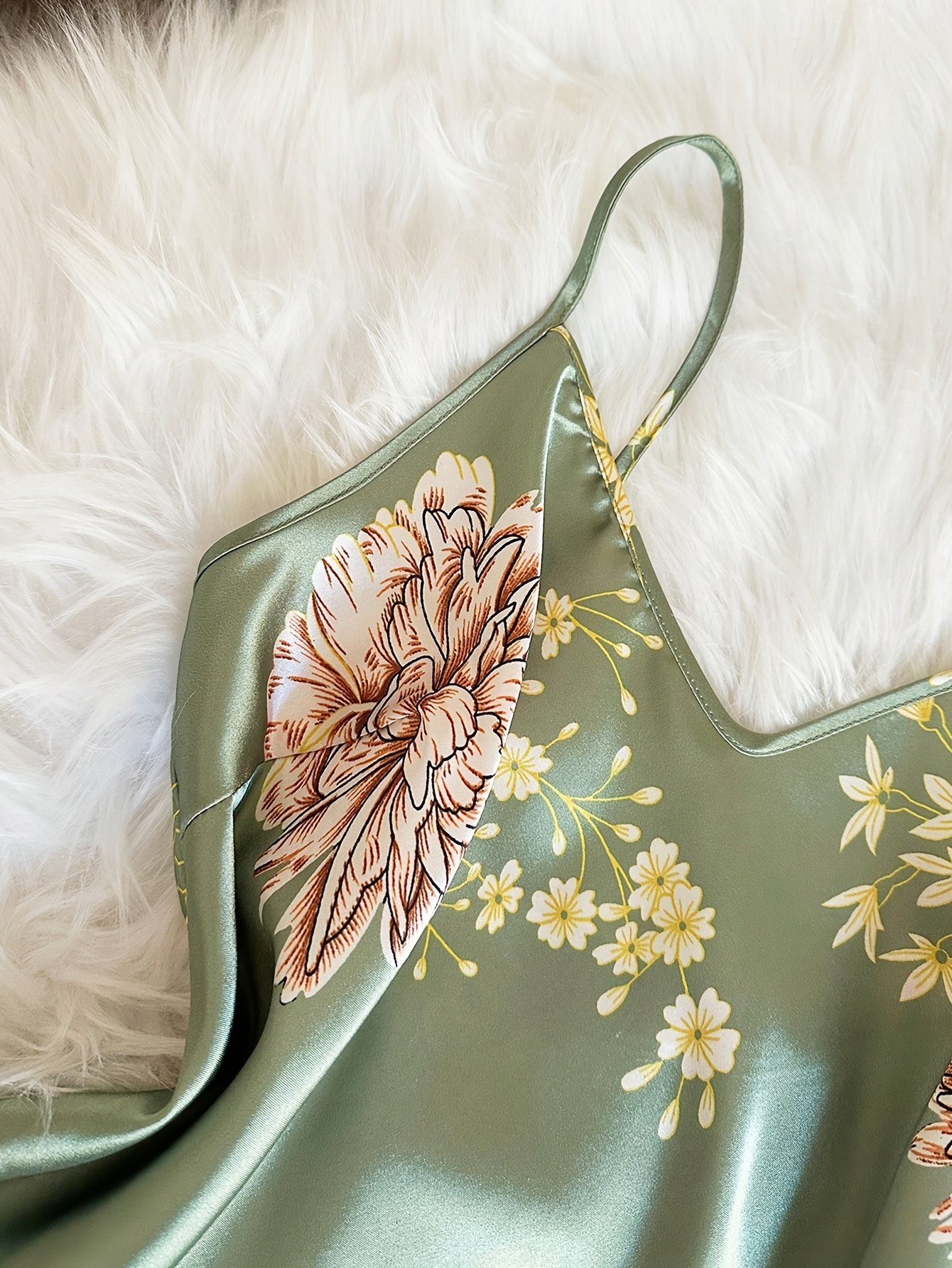 Be the first to review “Women’s 2-Piece Emerald Floral Satin Pajama Set – V-Neck Top & Ruffled Shorts”
