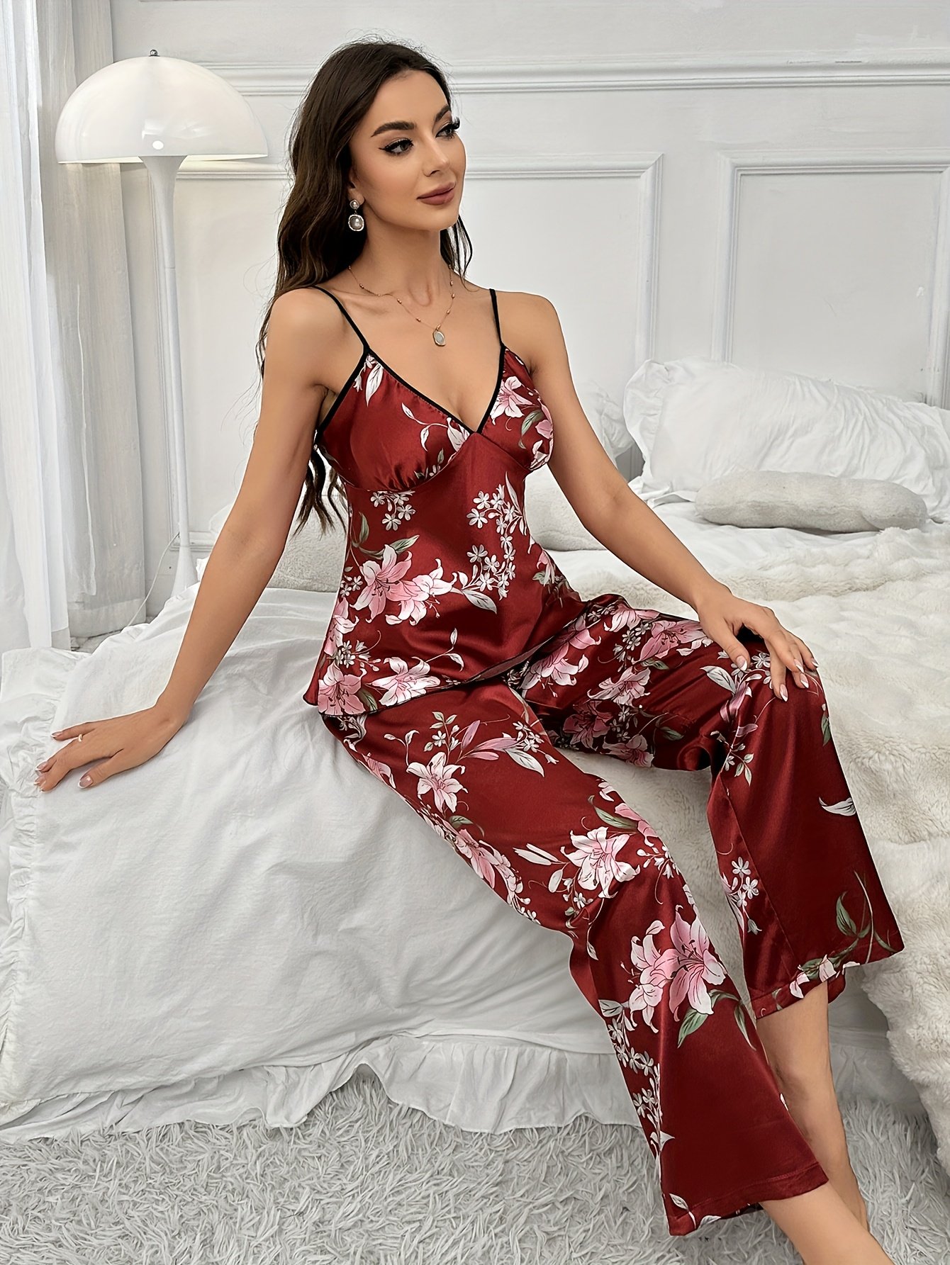 Constructed from high-quality, lightweight fabric, this pajama set feels soft against your skin. The breathable material ensures maximum comfort, making it ideal for warm nights or cozy indoor moments. The V-neck camisole is designed with a sexy yet subtle cut that flatters your silhouette while maintaining functionality. Meanwhile, the pants feature a relaxed fit with an elastic waistband for easy wear and unrestricted movement.