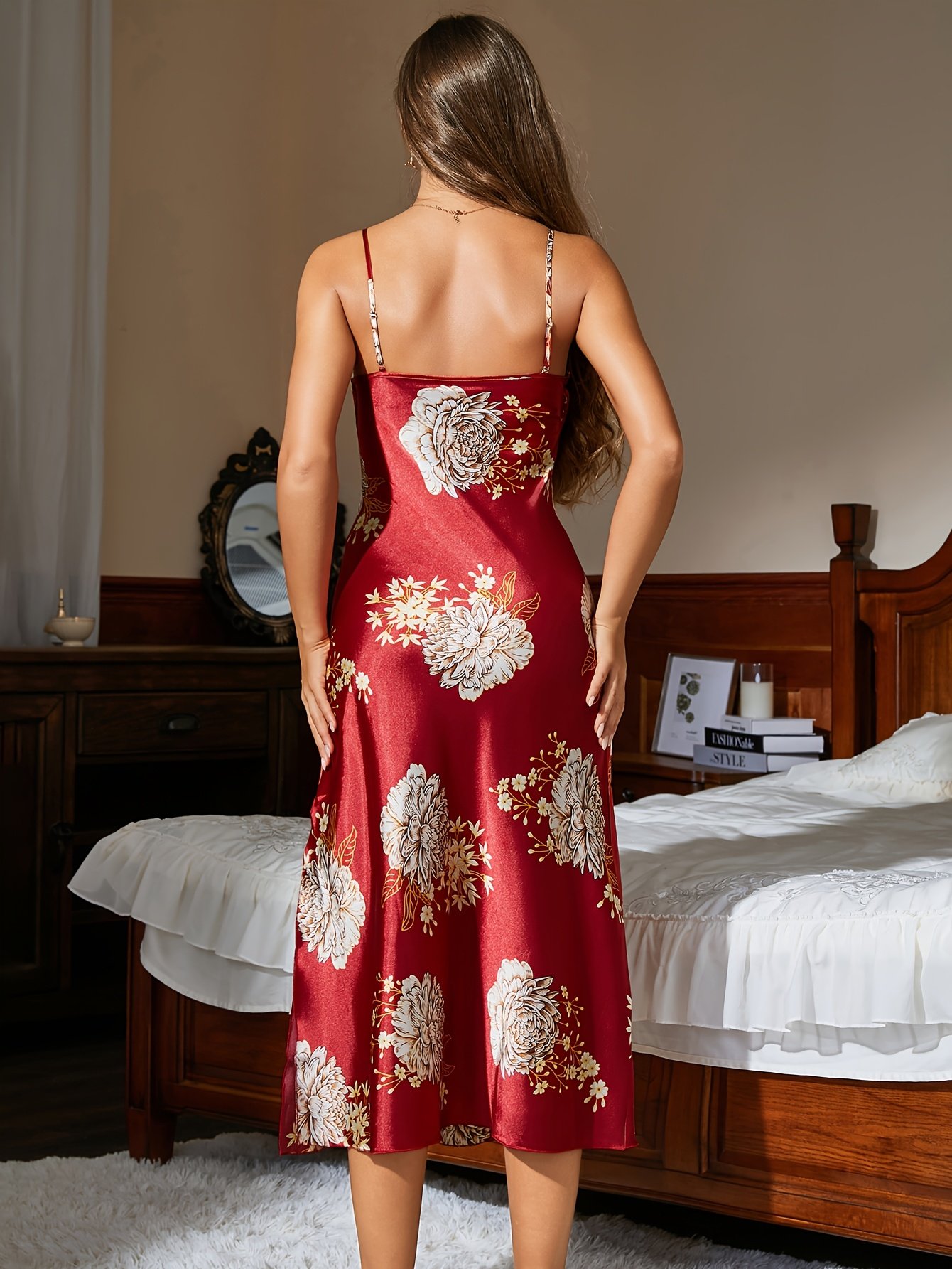 The alluring V-neckline and a strategically placed sexy side slit give this sleep dress a modern, feminine flair. The backless design ensures you feel cool and unrestricted, whether enjoying a casual evening at home or elevating your nighttime wardrobe. Comprised of breathable, high-quality materials suited for year-round wear, this nightgown is optimized to keep you comfortable no matter the climate. Additionally, its floral patterns coupled with its formal aesthetic elevate it beyond regular sleepwear, making it perfect for cozy yet stylish evenings.