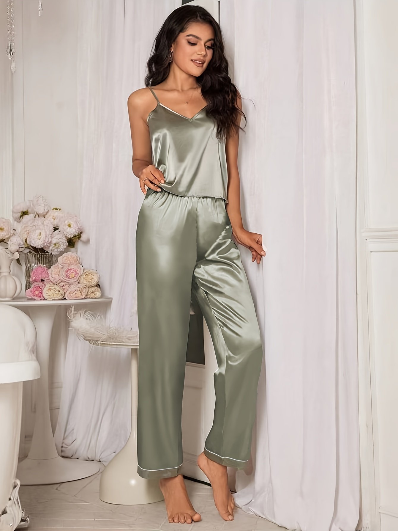 The pure-color satin pajamas exude sophistication with their minimalist design. Perfect for adults seeking refined yet casual apparel, its sleeveless V-neck and woven fabric help you stay cool, even in the hottest months. Whether lounging at home or preparing for a restful night’s sleep, this pajama set is your go-to summer companion. Make it a part of your seasonal wardrobe for ultimate breathability and style.